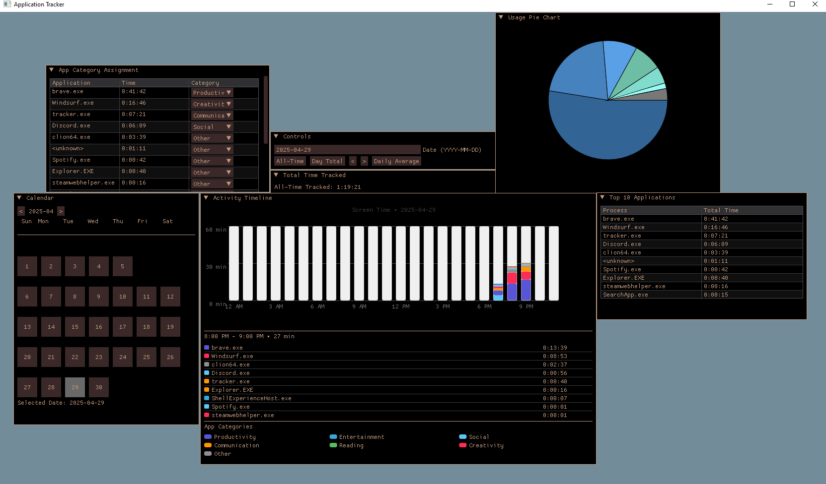 - Comprehensive desktop activity monitoring application built with C++ and ImGui, providing a detailed analysis of computer usage patterns. Features a clean graphical interface using OpenGL for rendering and visualization components.